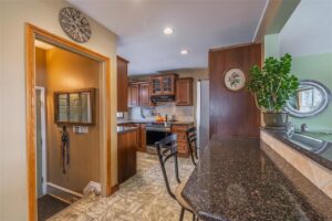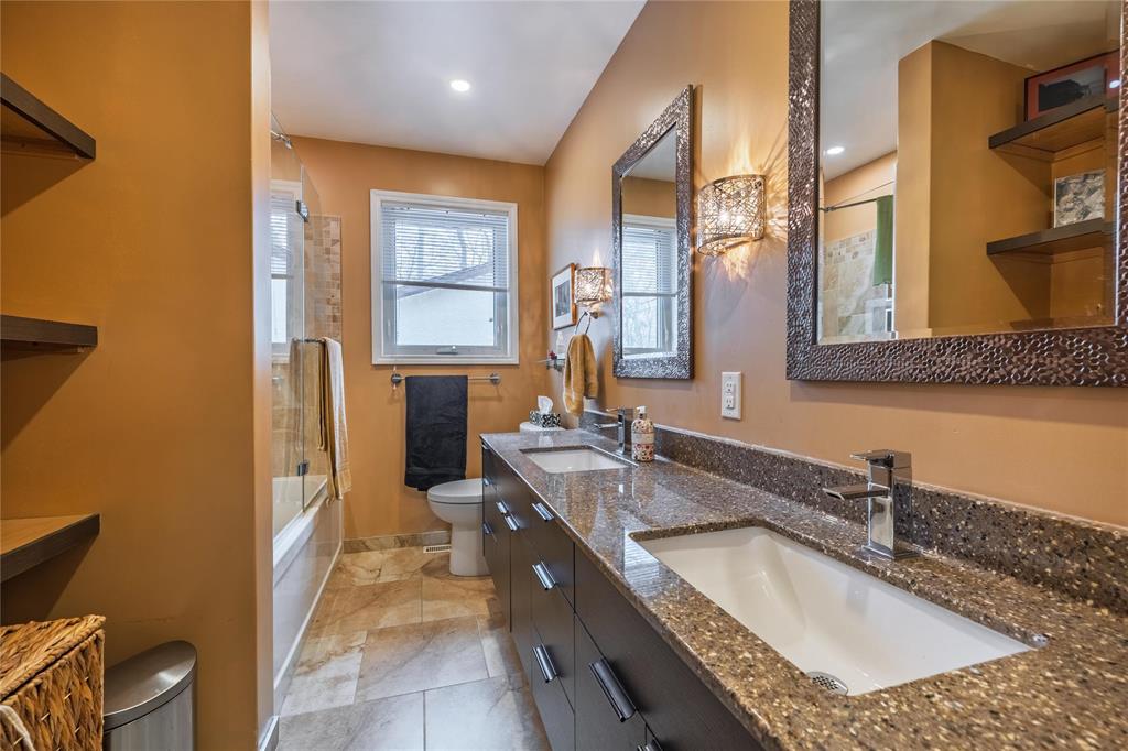 The main floor features hardwood flooring, a bright living area with updated tri-pane front windows, and an eat-in kitchen with dark oak cabinetry, granite countertops, and tile backsplash. The renovated main bathroom includes heated tile flooring, double sinks, and a glass/tile tub-shower combination.